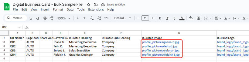 Enter your team details in the sheet. For more information about the sheet columns, check Column Description for Bulk Uploading Digital Business Cards.