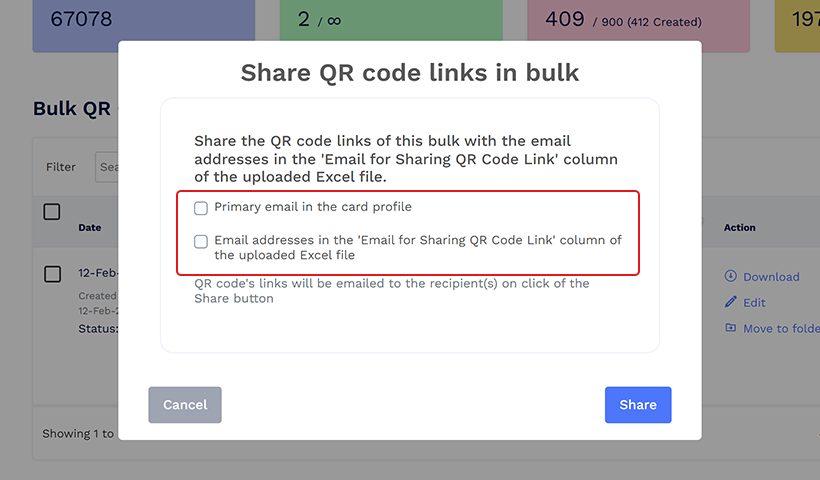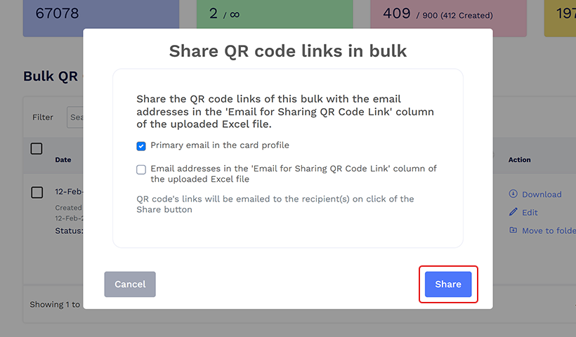 - Email for Sharing QR Code Link column in your uploaded Excel.