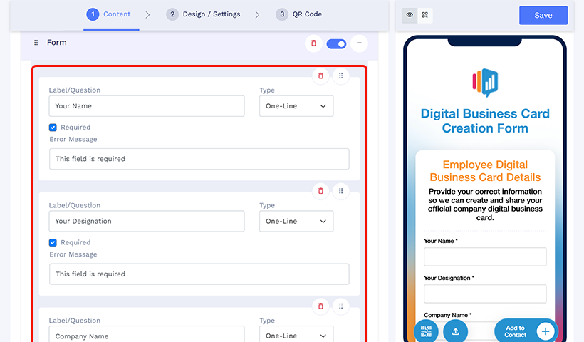 2.2 Add the form fields. Make sure these fields match the ones you added to your digital business card structure.