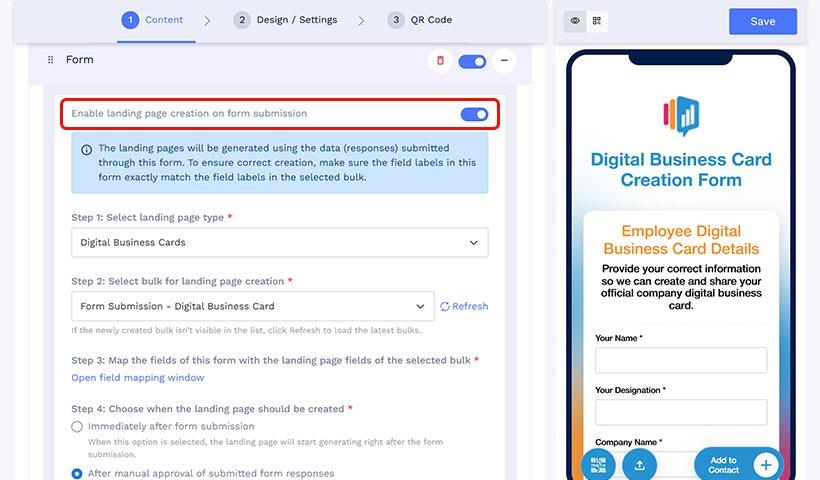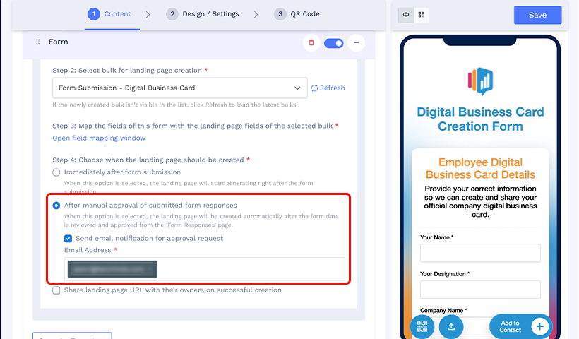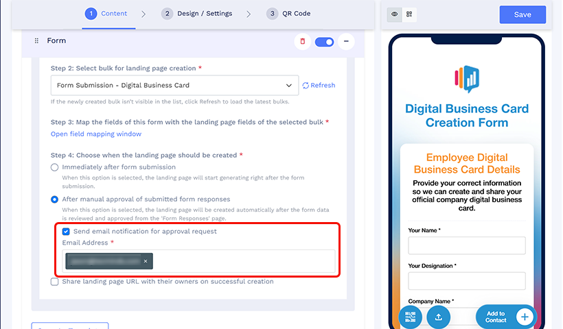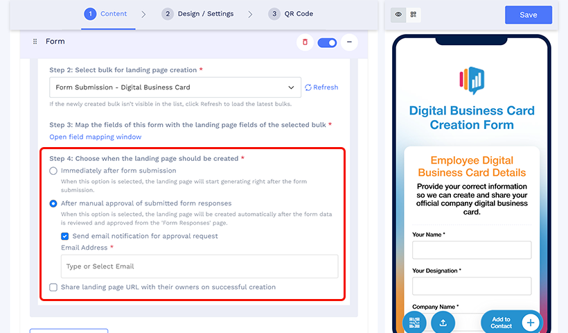 2.6 Choose whether you want the digital business cards to be created immediately after form submission or after manual approval from your side.