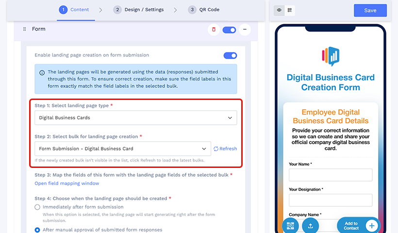 2.4 Set the landing page type to Digital Business Cards, select the bulk that you recently saved in the previous step.