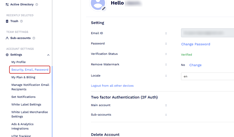 Click on the Settings menu on the navigation panel. Then click on Security, Email, Password.
