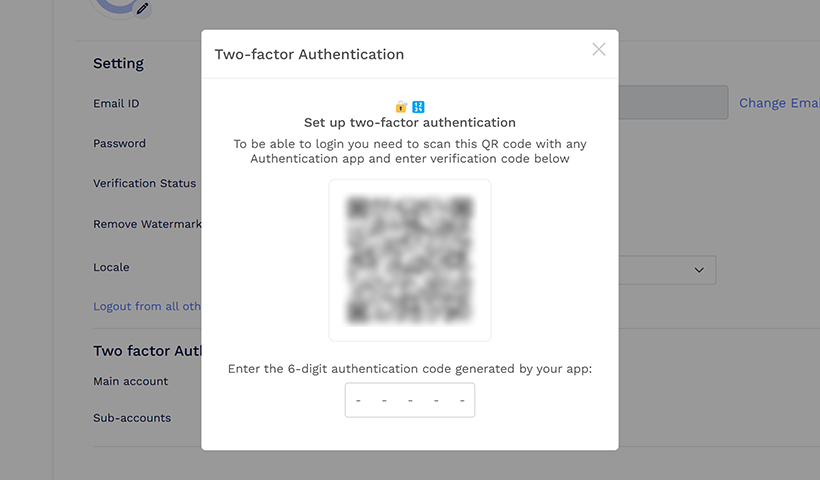 Upon enabling two-factor authentication, a pop-up for setting up two-factor authentication will display on the screen.