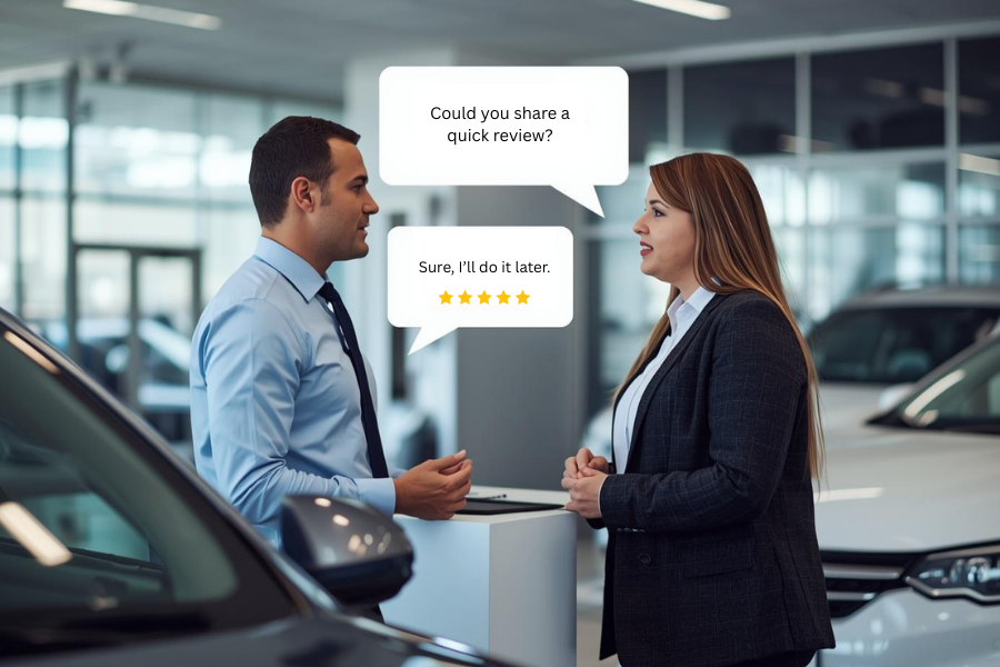 Some front-desk teams consistently requested reviews; others missed the opportunity during peak hours. Customers promised to leave feedback later, and rarely did. SMS and email campaigns averaged low engagement. New dealerships opened without a defined review workflow.