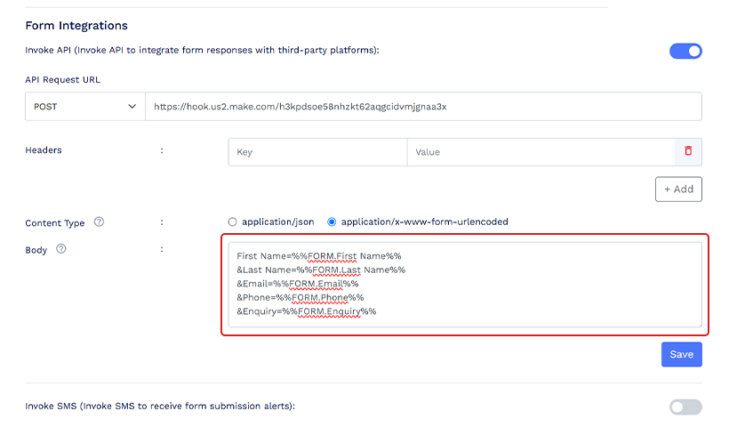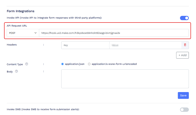 3.6 Paste your copied Make.com webhook URL in the API Request URL (POST) field.