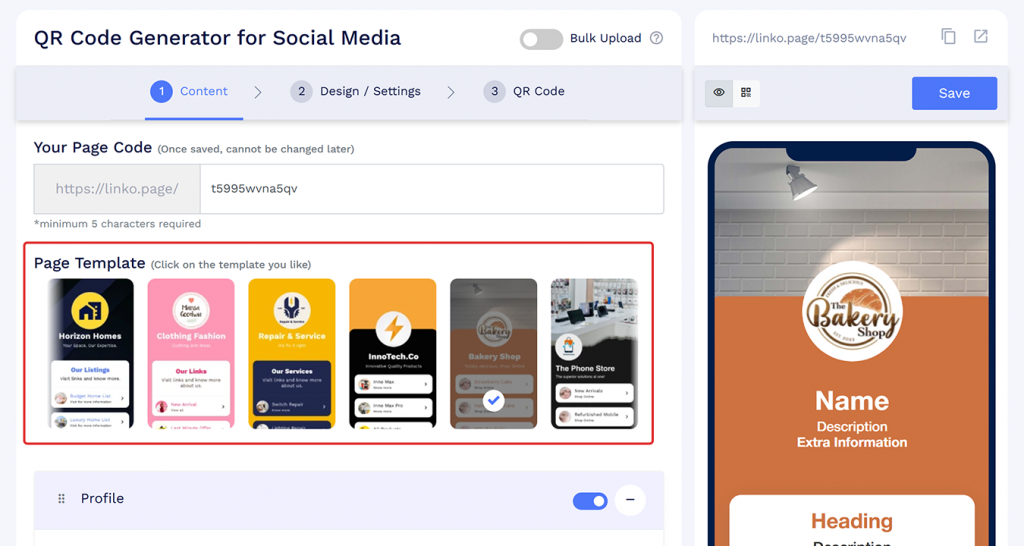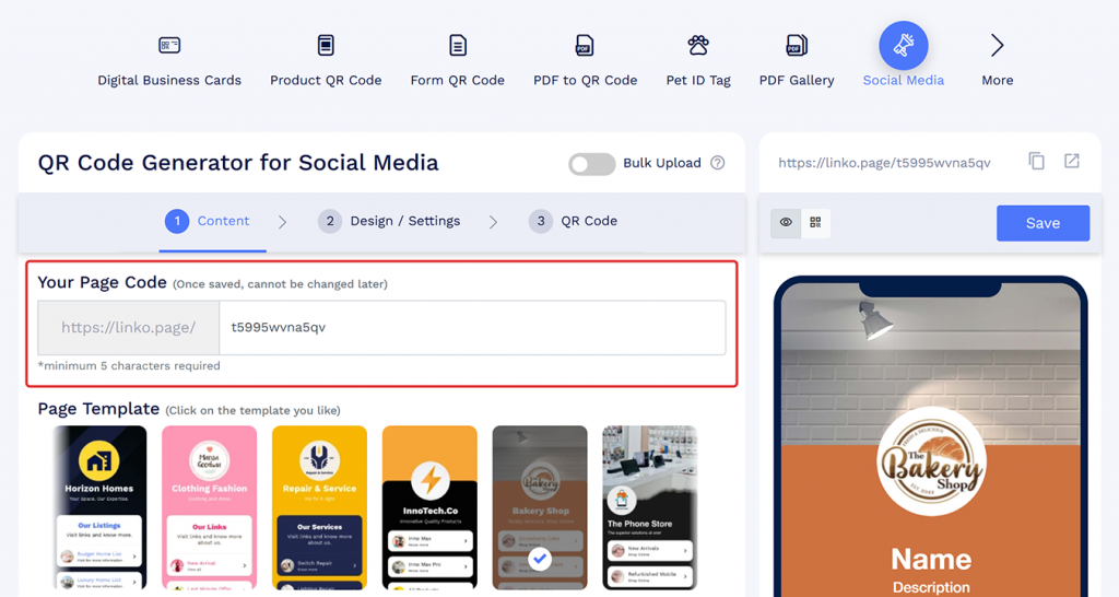 1. In the “Content” tab, enter a page code for your landing page under Your Page Code. The page code will be the URL of your social media landing page. If you skip this step, our system will generate the page code for you.