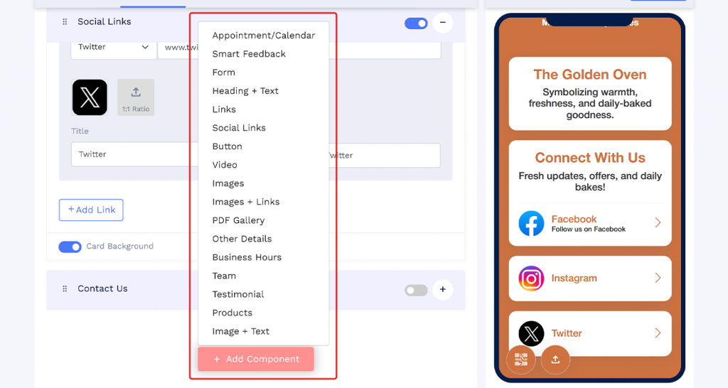 7. Click on the Add Component button to add more components, like forms, appointment calendars, and products, to your social media landing page.