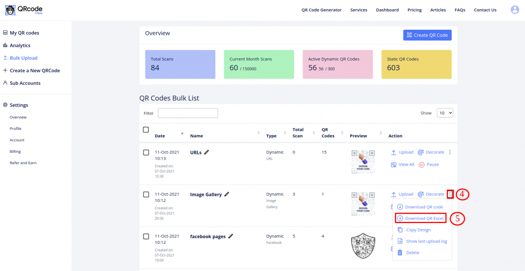 Step 2: Click on More Actions for the dynamic Bulk you wish to edit and select Download QR Excel.