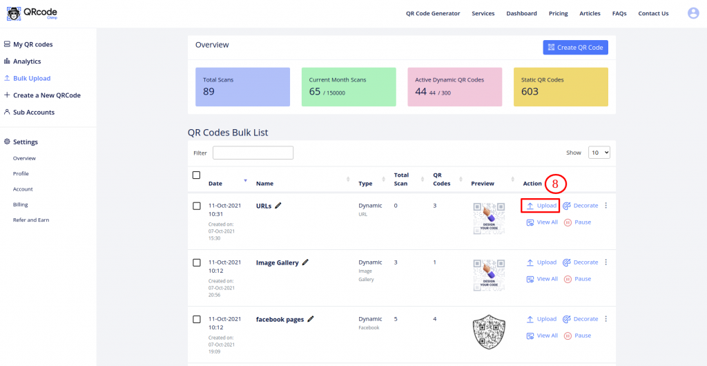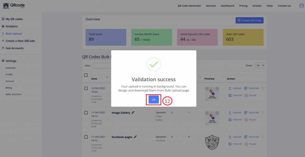 Bulk upload is a useful feature if you want to generate several QR codes simultaneously. With QRCodeChimp, you can not only create QR codes in bulk but also edit them.