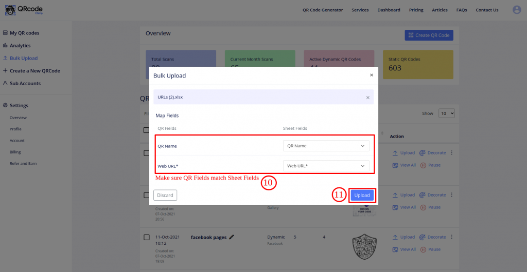Bulk QR code generation is an advanced feature available to PRO and Ultima users only. It lets you create thousands of QR codes at once by uploading an Excel file containing QR code data.