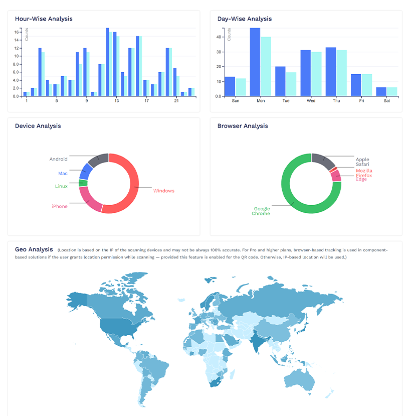 Time-based analysis: Hour-wise analysis: Monitor scans by the hour to identify when your audience is most active, ensuring you can optimize campaign timing. Day-wise analysis: Analyze daily trends to recognize peak engagement days, allowing you to plan your marketing efforts more effectively.