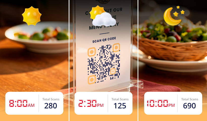 A café’s table-tent QR sees a spike from 7 p.m. to 9 p.m. You push a “Buy-1-Get-1” dinner promo in that slot and pause lunchtime ads that never convert.