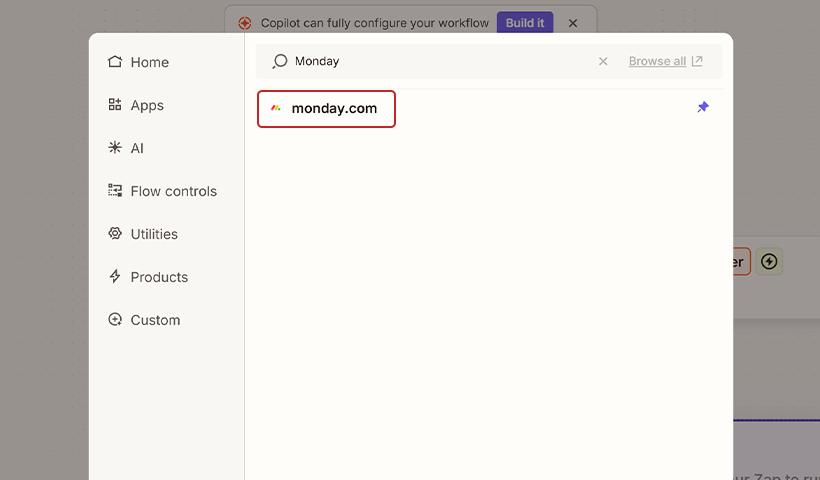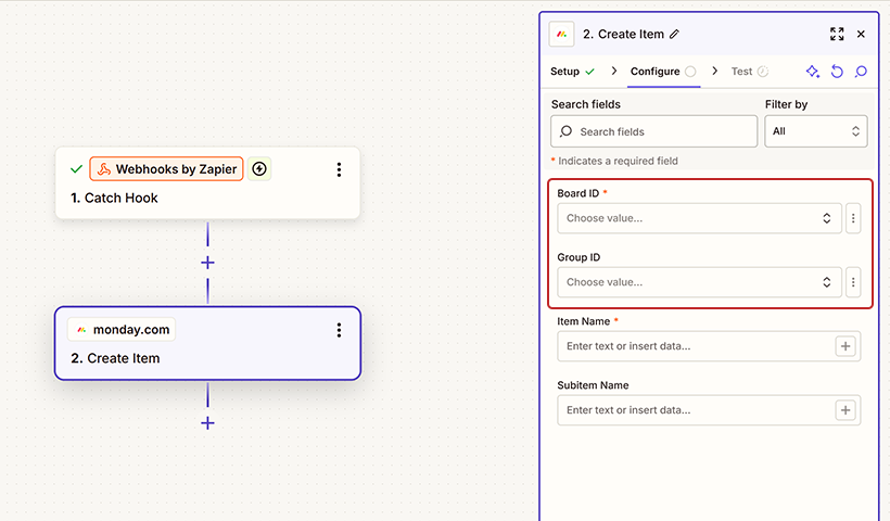 With Zapier now successfully capturing lead data, the final step is to configure the “Action” on what Zapier does with that data. The objective is to create a new item in a specified Monday.com board for every lead captured.