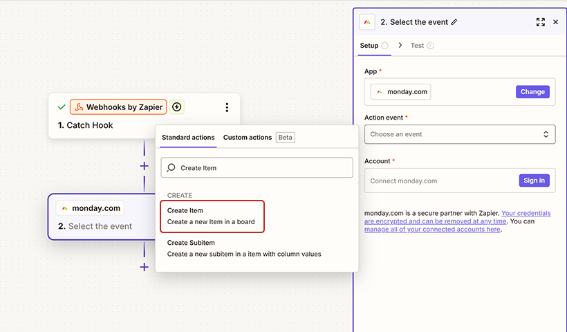Zapier encrypts webhook traffic in transit and at rest. Only your authenticated Zap can see the payload, and the Monday.com token restricts access to your chosen workspace.