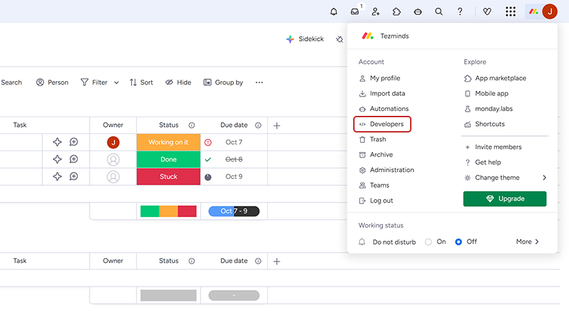 5. To find the Monday.com API key, follow these steps: In the Monday.com interface, click on the profile picture (avatar) located in the bottom-left corner of the screen, then select “Developers.” Inside the Developer Center, navigate to the Developer section on the left and click on My Access Tokens. The Personal API Token will be displayed; click to copy it and then paste it into the authentication window provided by Zapier.