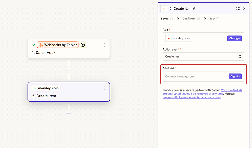 4. Zapier will prompt you to connect to a Monday.com account. Click Sign in and follow the on-screen instructions. This step will require an API v2 Token from Monday.com.