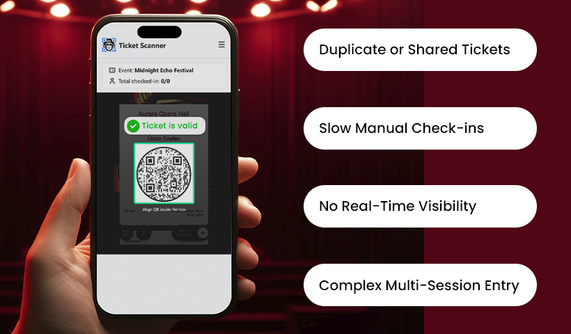 Attendees can share their tickets or screenshots with others. Without real-time validation, staff cannot verify whether a ticket has already been used, which can lead to unauthorized entries and overcrowding.