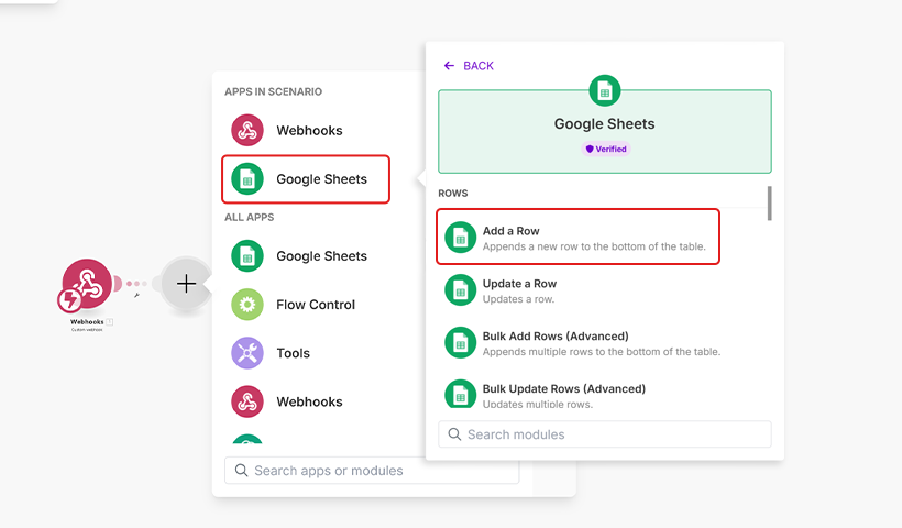Create a new scenario in Make.com and add a Webhooks module as the trigger. Copy the generated webhook URL and configure your QRCodeChimp form to send submission data to this URL.