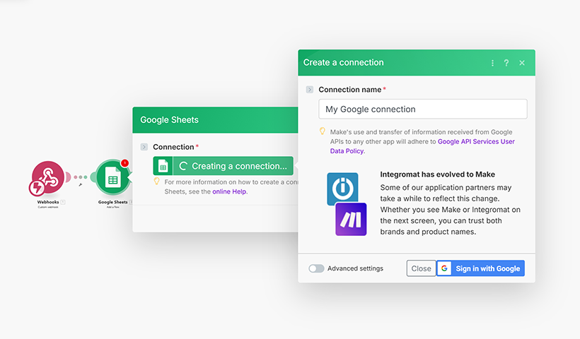 - Make (suitable) account with access to Webhooks and Google Sheets.