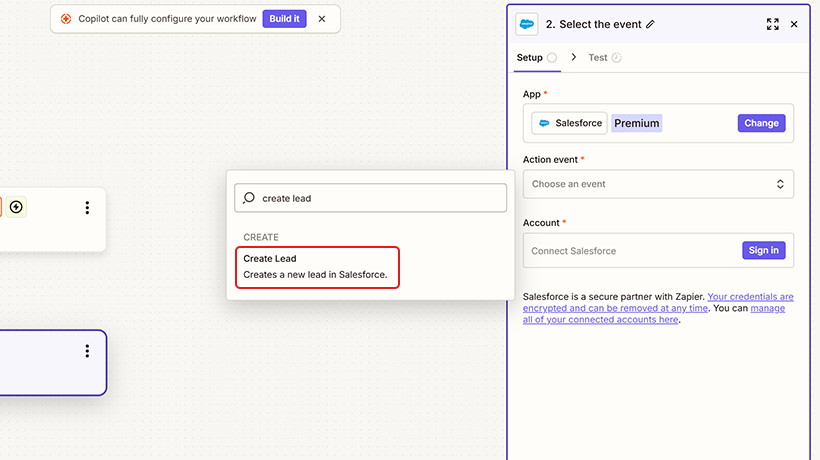 Now that Zapier is successfully capturing the data, we can instruct it on what to do with that data: create a new lead in Salesforce.