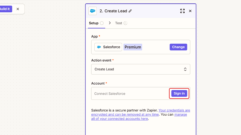 5. Zapier will now prompt you to connect your Salesforce account. Click the “Sign in” button. A pop-up window will appear, asking you to log in to your Salesforce account. Enter your credentials and grant Zapier permission to access your account.
